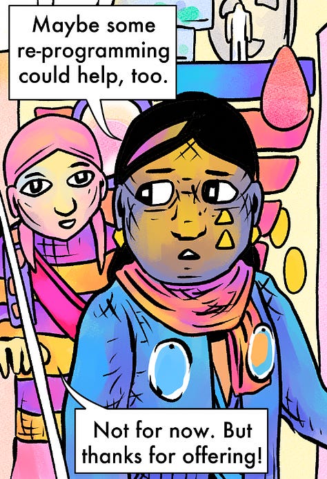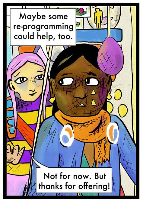 So much nicer, and also more consistent with the style I’ve settled into with later chapters. I don’t plan to go back and change everything (“to pull a George Lucas”? Or maybe the more thematically appropriate metaphor would be memory insertion), but I also want it to be as easy to read as possible. And also not look like a different artist drew everything after the first two chapters.
