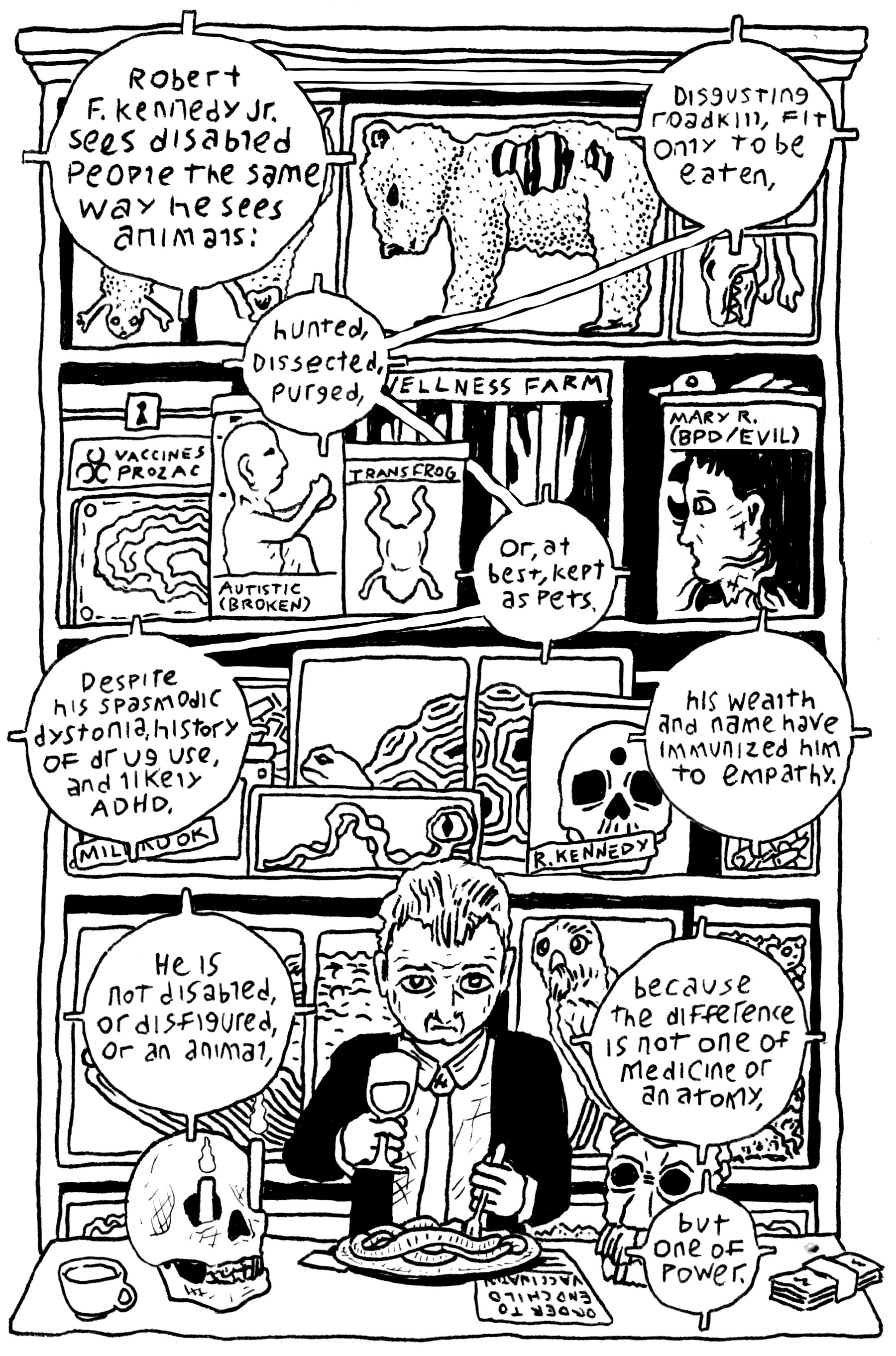I drew this back in December for the forthcoming first issue of a local comics anthology (Zine Diner Club). I decided to publish it now after hearing that he wants to collect private medical records from the NIH and create a "disease registry" for autism, which is not as bad as deporting political activists to death camps, but which is still not good.