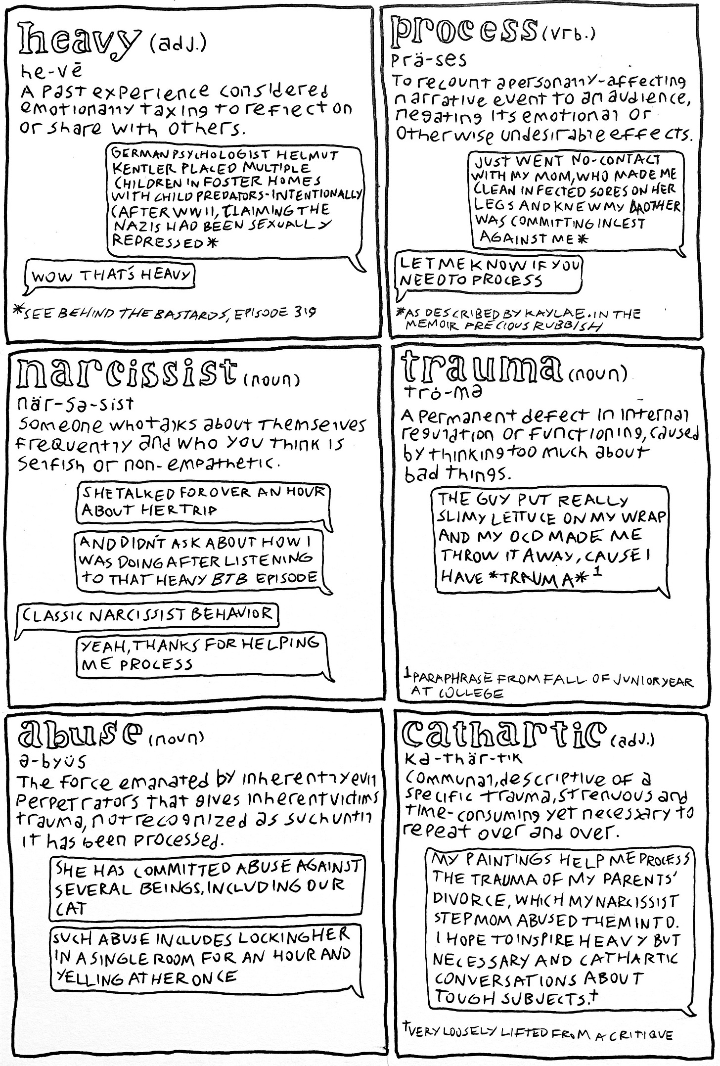 Not very happy with this one and might redo it later—should have started with the satire right away instead of two “real” examples, which muddy the message, though they do have the (unintended) effect of suggesting how hollow these words sound even when “properly” applied. I even had a cool meta-comedy effect planned where I mocked myself for how petty it is to make fun of people for just using the words they have for experiences I haven’t had and don’t have the right to judge, but again, can’t have meta-comedy when the first two panels are deadly serious. Ah well.