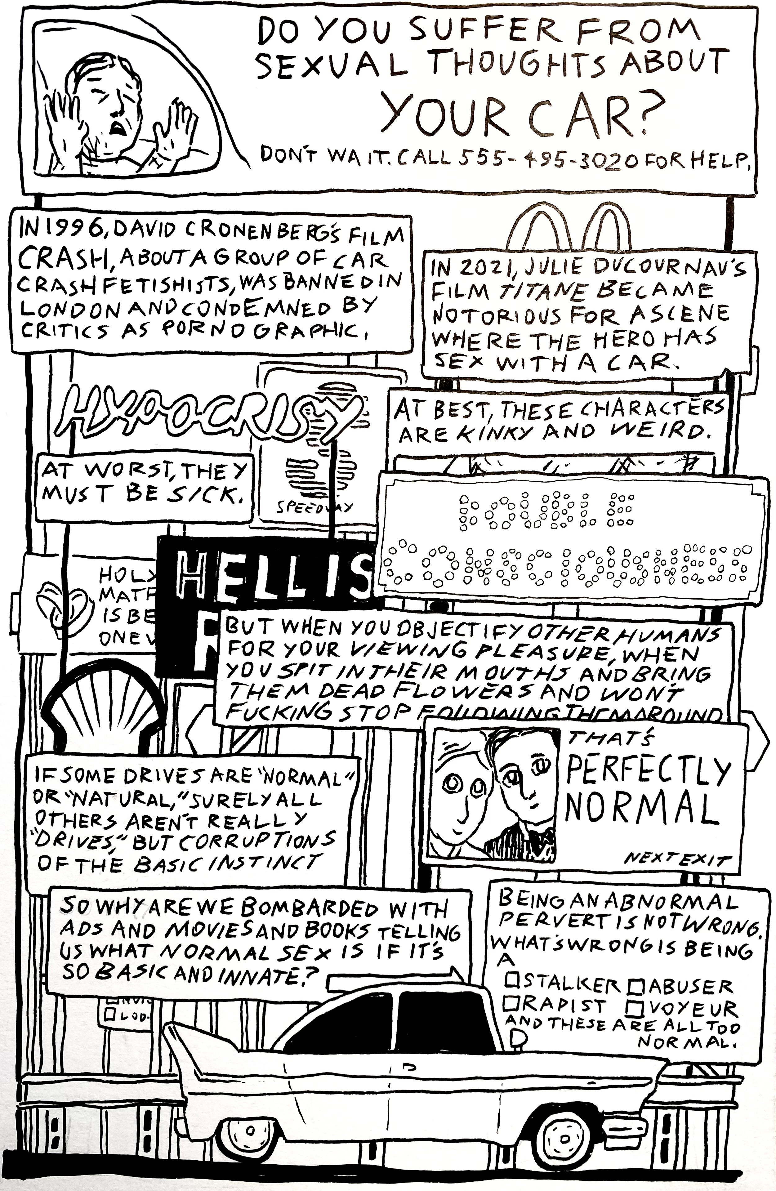 I intend to rephrase the ending for the final edition—I mean “pervert” as an ironic term for anyone classed as “deviant,” but I realize it’s also used to refer to people who actually commit acts of sexual violence (esp. surveillance or voyeurism). My point here is, of course, that sex itself is neutral (albeit a grotesque waste of time and energy) and it’s violence that’s the problem.