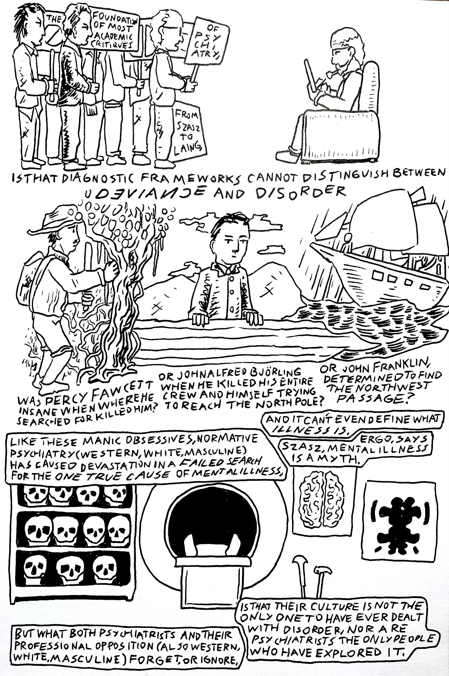 • “Indigenous people and pathologized people are basically the same”—while I am trying to draw a metaphor between how colonists view their targets as “uncharted” and how psychiatrists view mental illness as an “abyss,” the experience of colonization is vastly more horrific and extensive than any disordered patient experience.