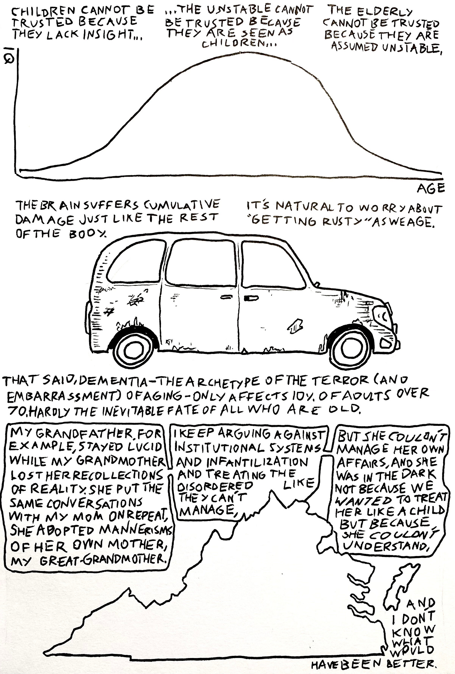 The obvious response is “well, dementia’s different than what you talk about,” in response to which I’ll just say that we play this balancing game between “respecting the disorder” and “respecting the autonomous adult” all the time, even in less serious cases than dementia (or cases that aren’t even illness):