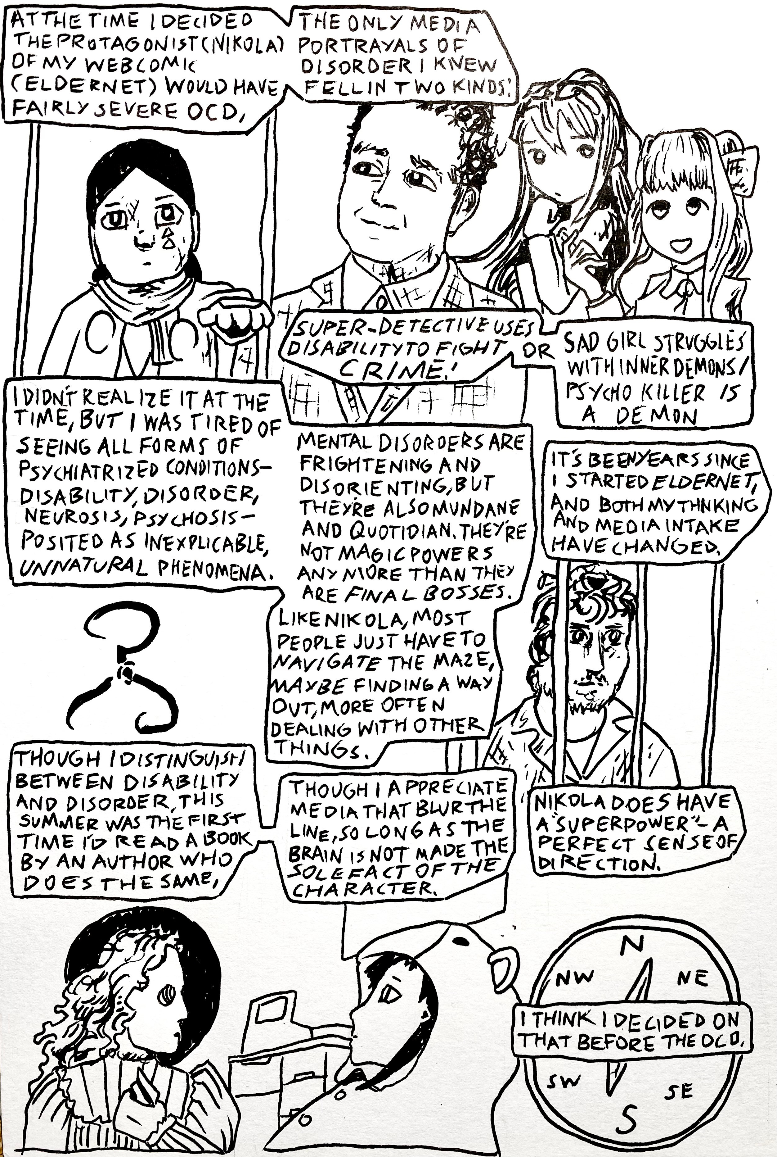 I use disability in reference to largely immutable material conditions, and disorder in reference to pathological bio-psycho-social patterns. Autism is a disability because it’s a neutral, material neurosomatic experience (it can’t nor should be “cured”). BPD (just to use a random example I haven’t brought up yet) is a disorder because it’s a system of thoughts and behaviors that destabilizes safety, comfort, and efficiency. There’s obviously a lot of crossover I can’t really get into here, but suffice to say I try and avoid lumping in autism (and other forms of neurodivergent disability) with the disorders whenever possible. I’m providing this annotation because this comic could conceivably be read as stating the opposite, and I want to be clear about my position.