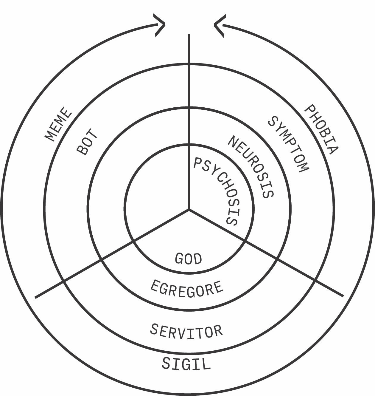 On the transcendent digital plane, media is reality, and memes automate which images, videos, and text users find important enough to copy and share. Bots automate the structures through which that information passes, the apps and popups analogous to the households and villages that host servitors. Web crawlers automate search results, spambots automate junk mail, and chatbots automate customer service, selecting what the screen displays and what remains unconscious. As insubstantial as servitors, they work not in the limits of religious networks, but on the universal platform of the internet. A bot is a demon that everyone believes in.