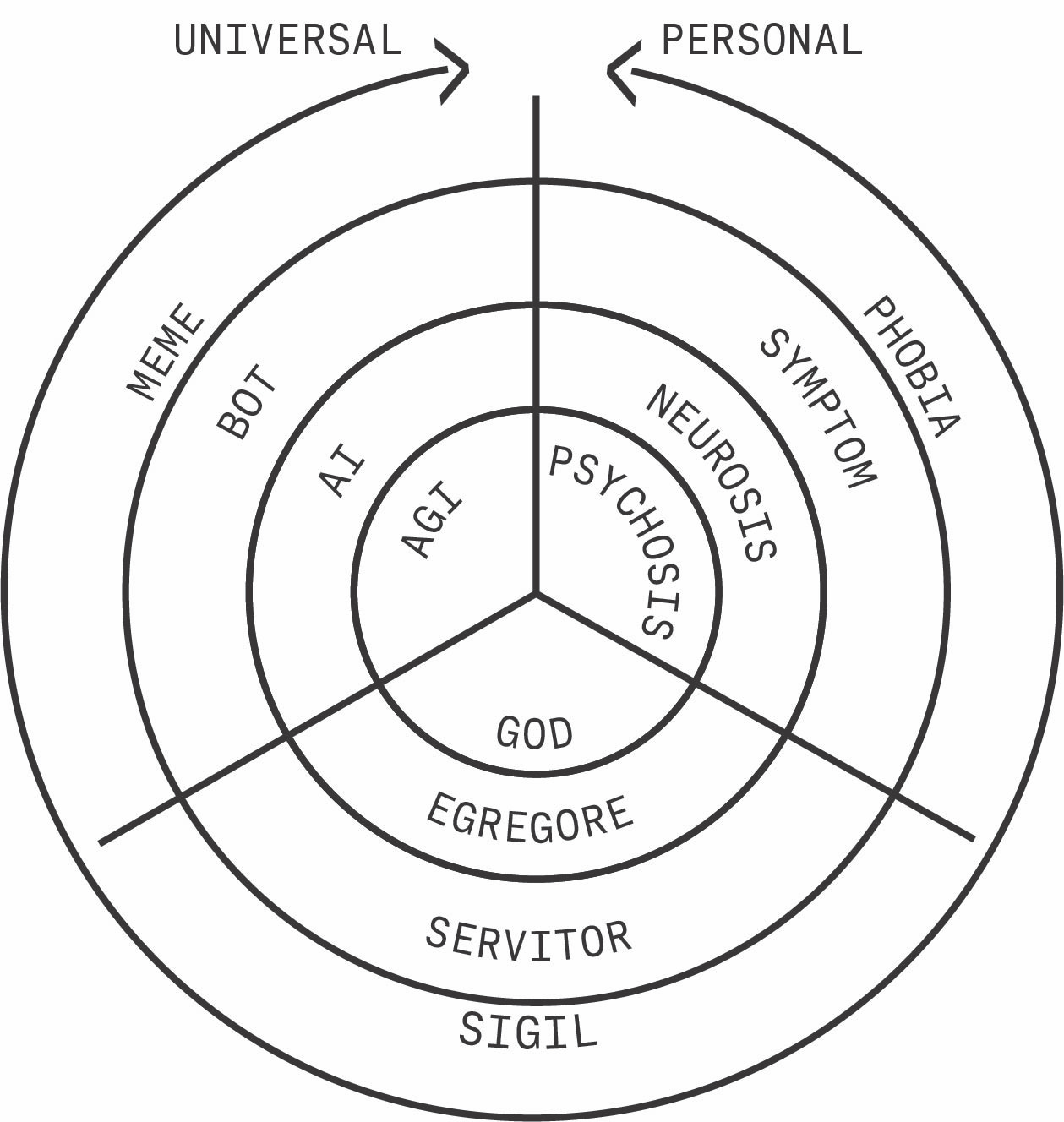 AIs act as universal egregores. Unlike egregores, which stay localized to religious groups, the universal nature of computing allows AI to automate all communication. The Accelerationists, Rationalists, and influencers predict the completion of automation, ascribing religious significance to the symbols of AI themselves and producing occult models for occult software. In so doing, they simulate a version of AI that exceeds not only present limits, but all limits. This AI would not just automate conversations, images, or sound, but all possible forms of information. It would be an Artificial General Intelligence, or AGI.